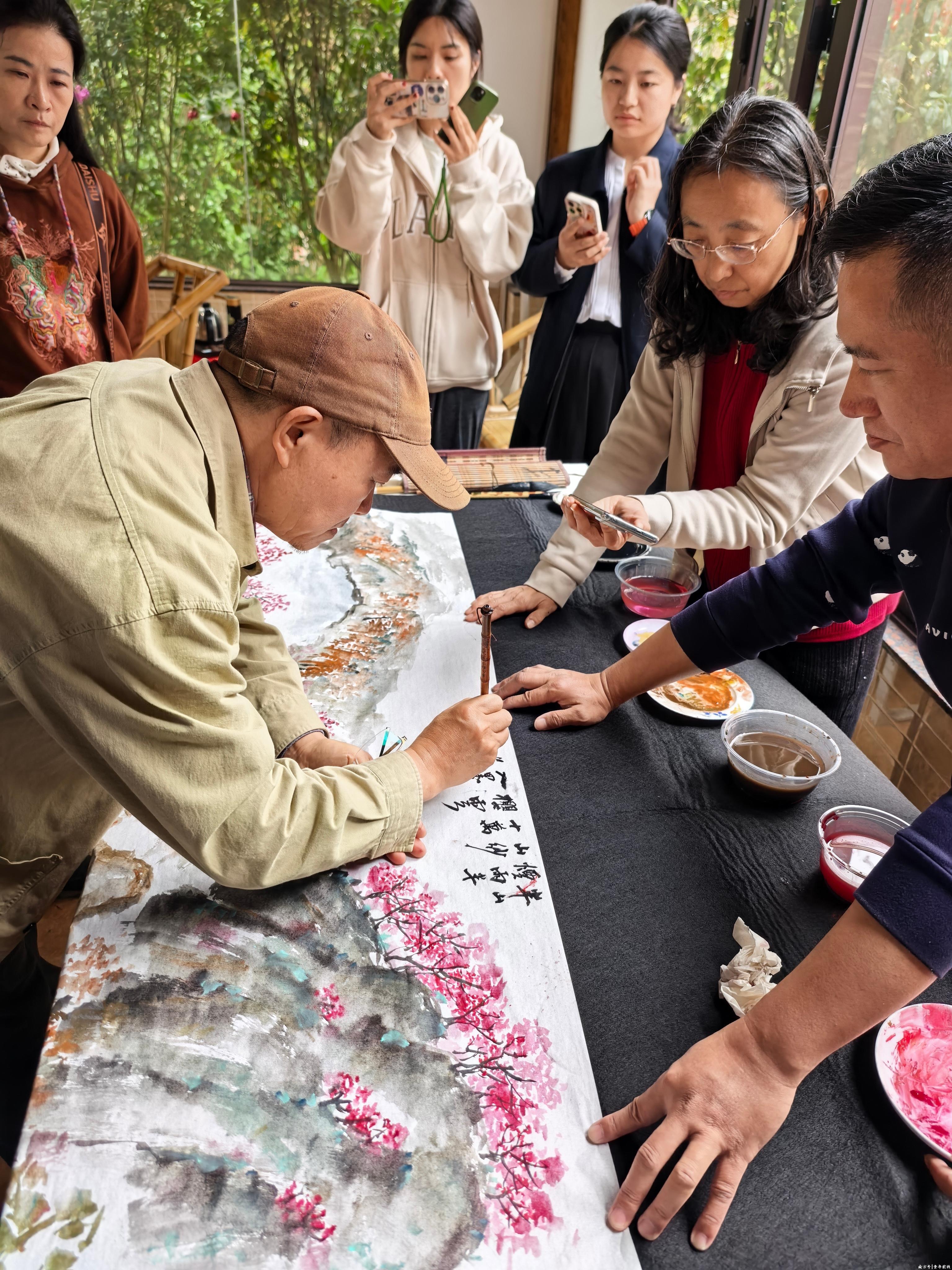 “烟雨逢春天恰好,樱红蒙泽春还早。早春二月帽峰行,只怕无诗春易老。”在樱花诗会上,诗人们以帽峰山的美景为灵感,即兴创作并吟诵诗歌,用文字描绘出帽峰烟雨的浪漫与诗意;书法家们挥毫泼墨,留下一幅幅精美的书法作品;画家们则用画笔捕捉春日的色彩,将樱花的烂漫、桃花的娇艳定格在画布之上。樱花诗会上亮点频现,书法家谢光辉、诗人夏致以及画家姚静毅、刘成发、尹芳平等在现场联合创作了“樱花盛放”图一幅,刘成发创作的樱花小品题上了诗人黄日暖现场创作的樱花诗句、谢光辉题写的“雾峰神韵”小篆一幅与现场烟雨蒙蒙的景象交相辉映……最后这些作品都统一赠送给帽峰山景区收藏、展示。