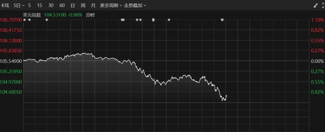 美元指数跳水,截至发稿,跌近1%。