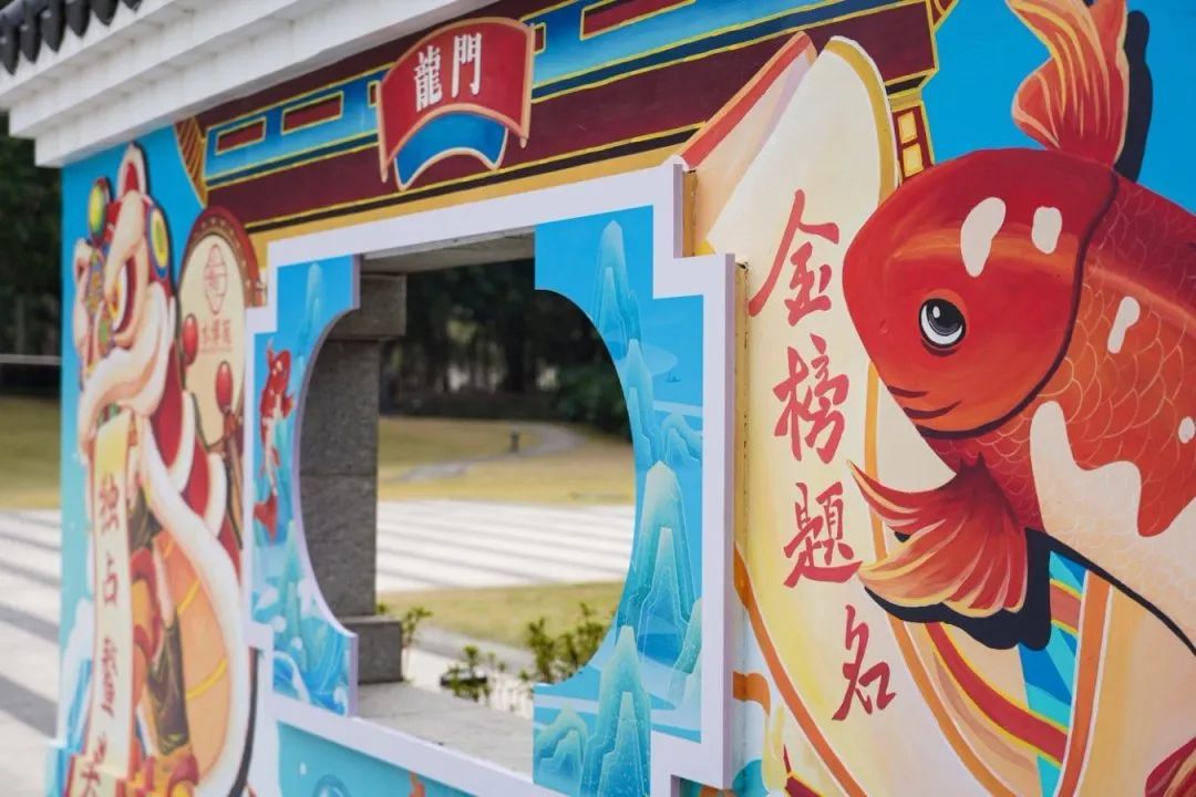 还有一面墙则以“鱼跃龙门”为主题,“龙门”一侧是醒狮叼着“金榜题名”祝福语,一侧是水中跳跃的锦鲤配以“金榜题名”四字,中间设有龙舟造型的“中流击楫”互动打卡装置,这些巧妙的设计都表达着对“一举高中”的美好祝愿,市民游客可置身其中拍照。